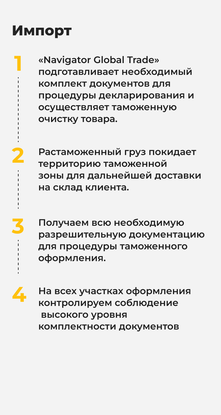 Navigator Global Trade специализируется на доставке сборных грузов по всему миру, вне зависимости от предмета транспортировки. Наши специалисты осуществят полный спектр услуг от подготовки груза до завершения логистических операций. Совершенно неважно, решите вы купить текстиль, промтовары или технику.